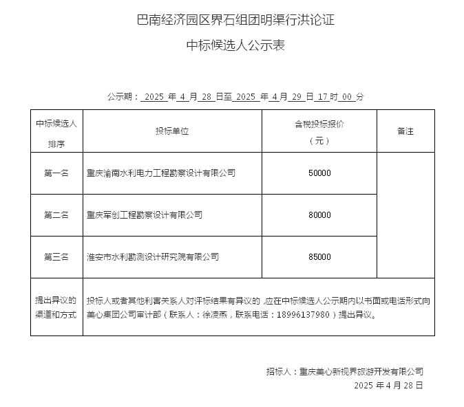 巴南经济园区界石组团明渠行洪论证 中标候选人公示