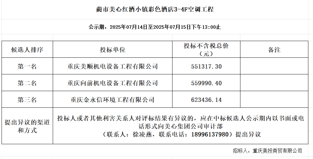蔺市美心红酒小镇彩色酒店3-4F空调工程 中标公示