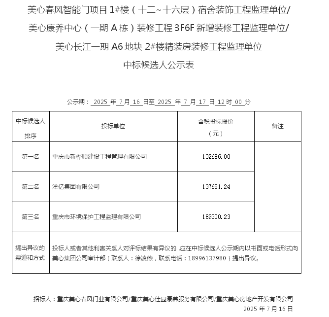 春风智能门项目1#楼(十二~十六层)宿舍装饰工程/康养中心(一期A栋)装修工程3F6F新增装修工程/A6地块2#楼精装房装修工程监理单位 中标候选人公示