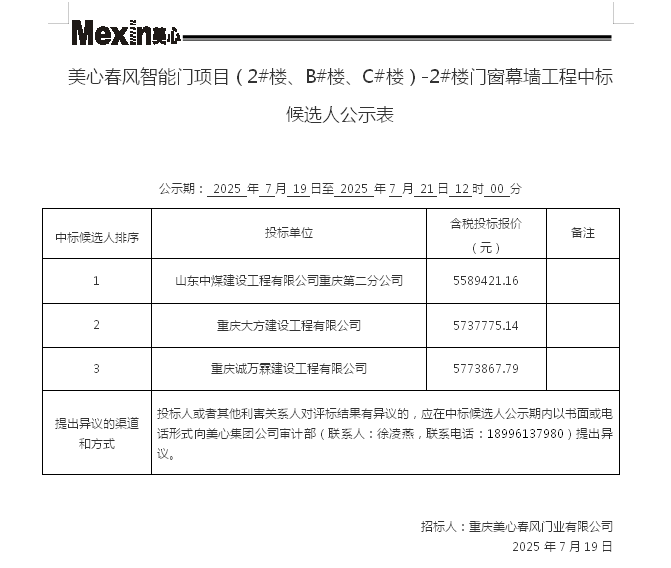 美心春风智能门项目(2#楼、B#楼、C#楼)-2#楼门窗幕墙工程中标候选人公示