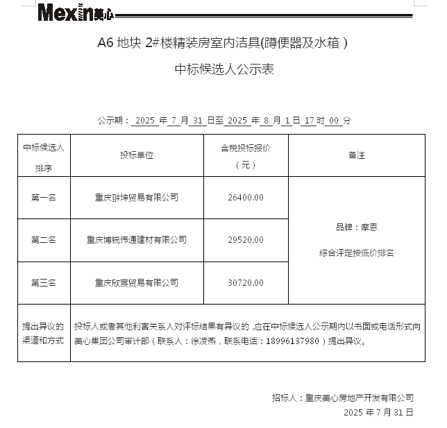 A6地块2#楼精装房室内洁具(蹲便器及水箱) 中标候选人公示