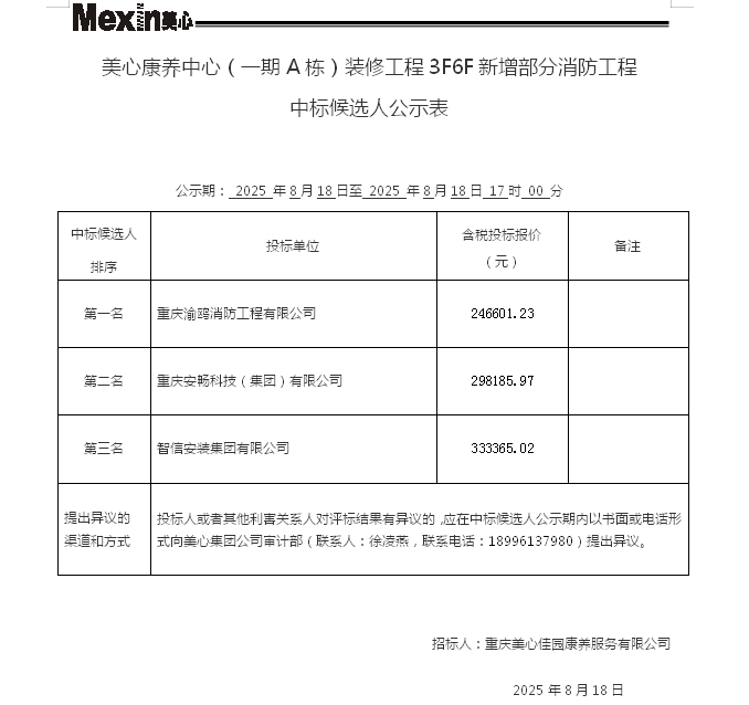 美心康养中心(一期A栋)装修工程3F6F新增部分消防工程中标候选人公示