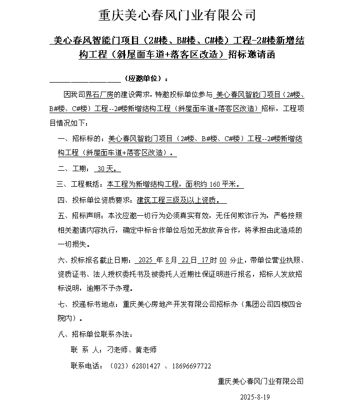 美心春风智能门项目(2#楼、B#楼、C#楼)工程-2#楼新增结构工程(斜屋面车道+落客区改造)招标邀请