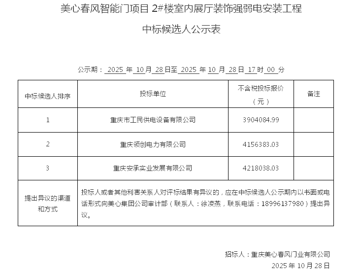 美心春风智能门项目2#楼室内展厅装饰强弱电安装工程 中标候选人公示