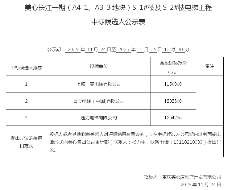 美心长江一期(A4-1、A3-3地块)S-1#楼及S-2#楼电梯工程 中标候选人公示