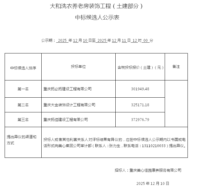 大和洗衣养老房装饰工程(土建部分) 中标候选人公示