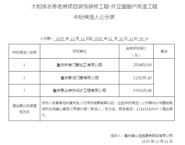 大和洗衣养老房项目装饰装修工程-外立面窗户改造工程 中标候选人公示