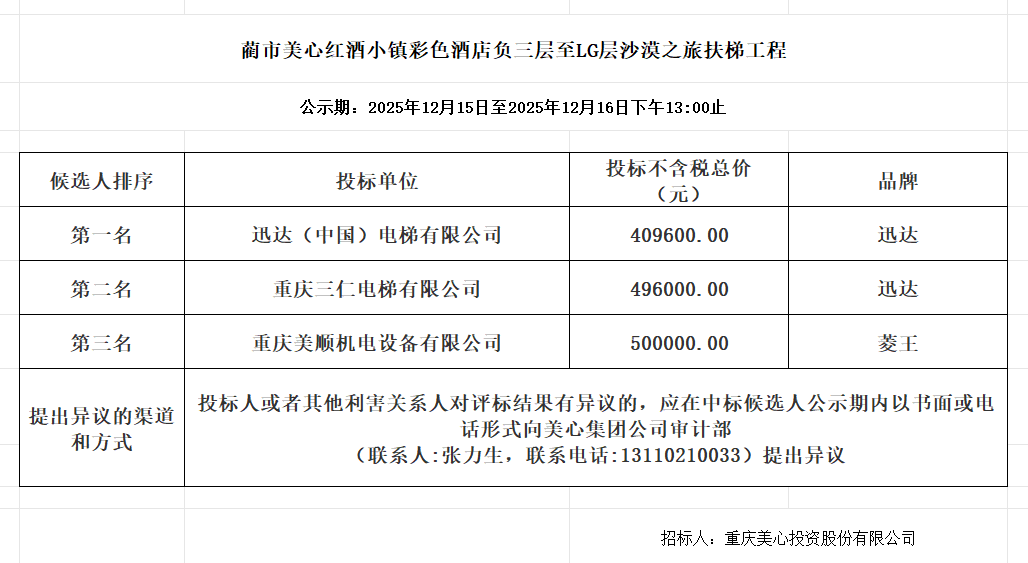 蔺市美心红酒小镇彩色酒店负三层至LG层沙漠之旅扶梯工程 中标公示