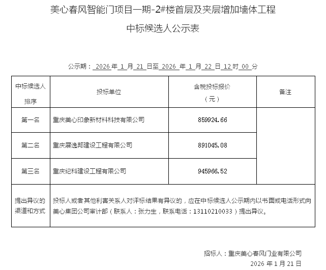 美心春风智能门项目一期-2#楼首层及夹层增加墙体工程 中标候选人公示
