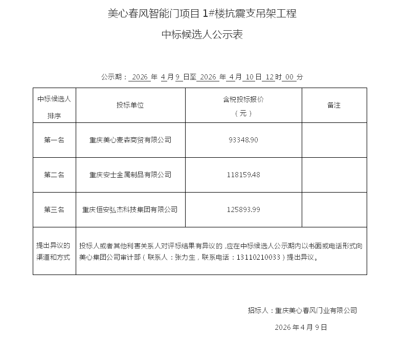 美心春风智能门项目1#楼抗震支吊架工程中标候选人公示