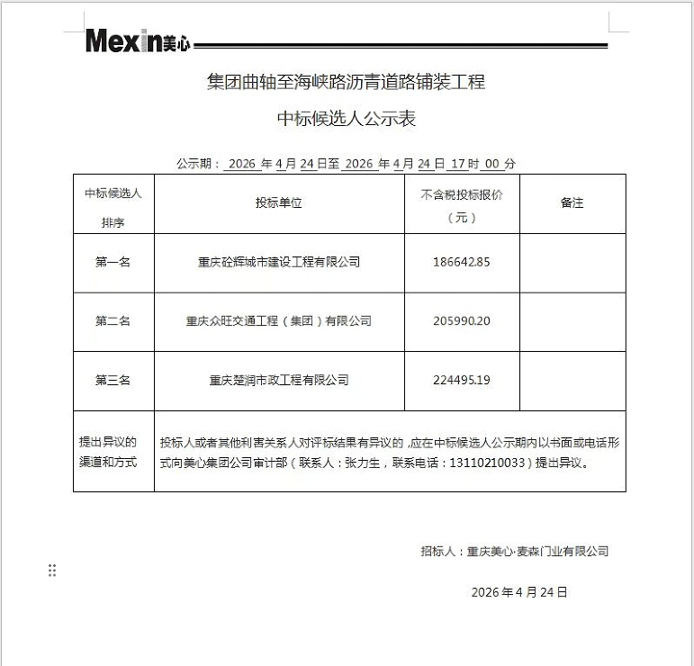 集团曲轴至海峡路沥青道路铺装工程中标公示
