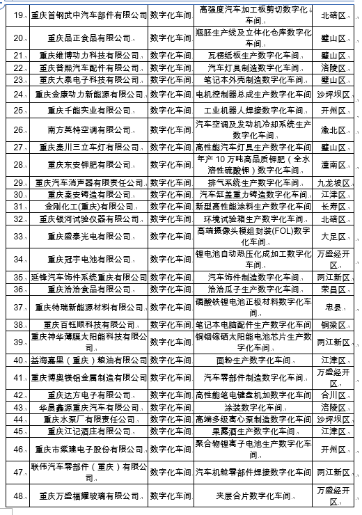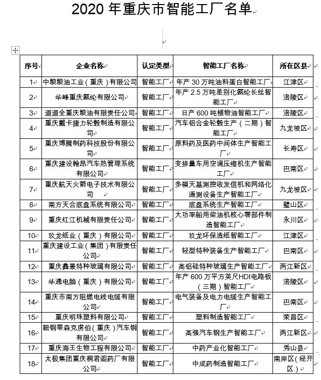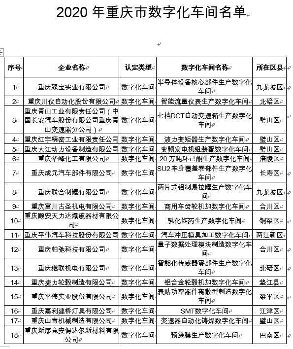 7月1日,上游新闻·重庆晨报记者从重庆市经信委获悉,经过企业自愿申报、区县经信主管部门初审、专家评审等程序,2020年重庆市数字化车间和智能工厂认定结果出炉。