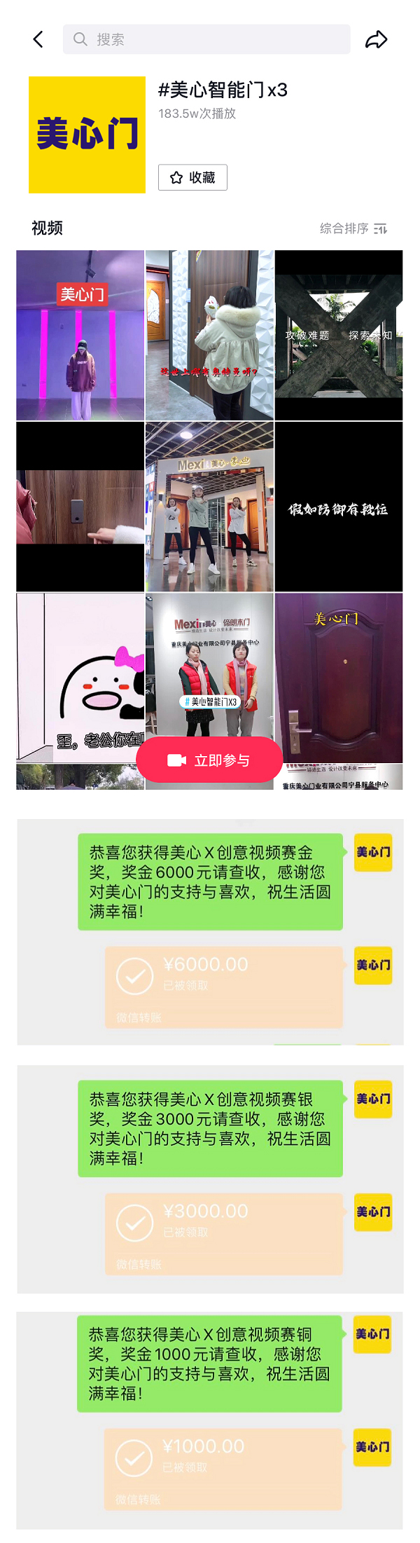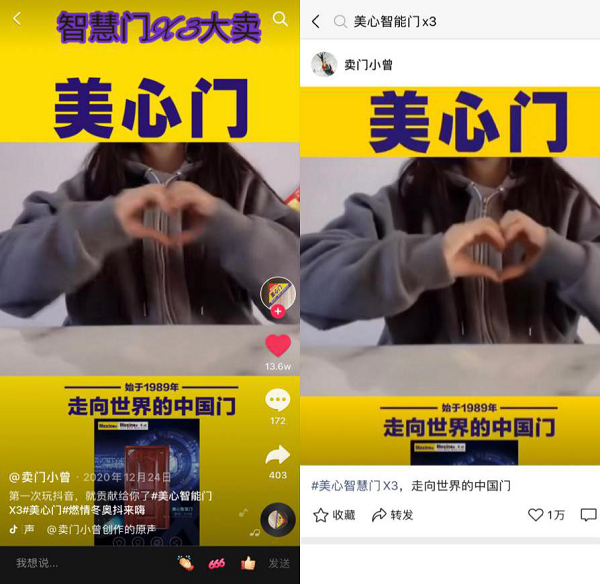 美心品牌始终遵循“用户至上”的宗旨,发起X创意视频赛,借助抖音平台的流量导向,直接与用户对话,打破了时间、空间壁垒。美心视频赛以承载了美心智能门X3概念的活动告知了广大消费者、经销商、业务员等最新门类产品的资讯,实时推荐,同时借助征集而来的各种视频内容,为品牌提供发展创意,双向沟通与需要。
