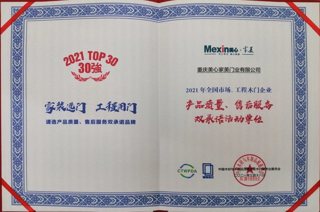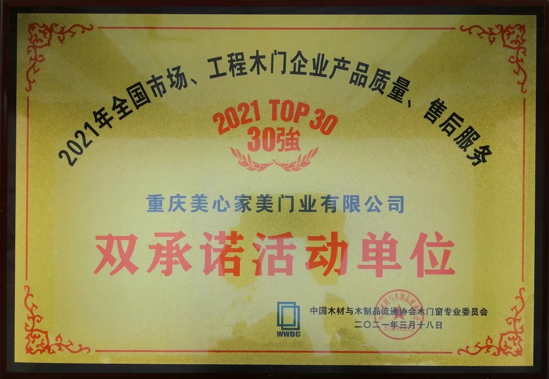 美心家美荣膺“2021年全国市场、工程木门企业产品质量、售后服务双承诺活
