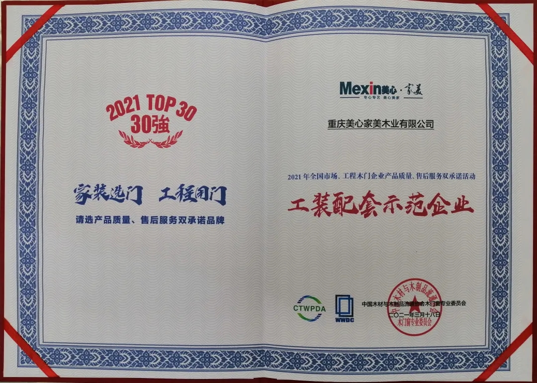 美心家美身处其中,不断在各种变量变局中笃定方向,克难前行,在中国木门一线品牌之列占据了举足轻重的一席之地。本次与会,美心家美公司荣膺“2021年全国市场、工程木门企业产品质量、售后服务双承诺活动单位”,“2021年全国木门双承诺活动工装配套示范企业”。