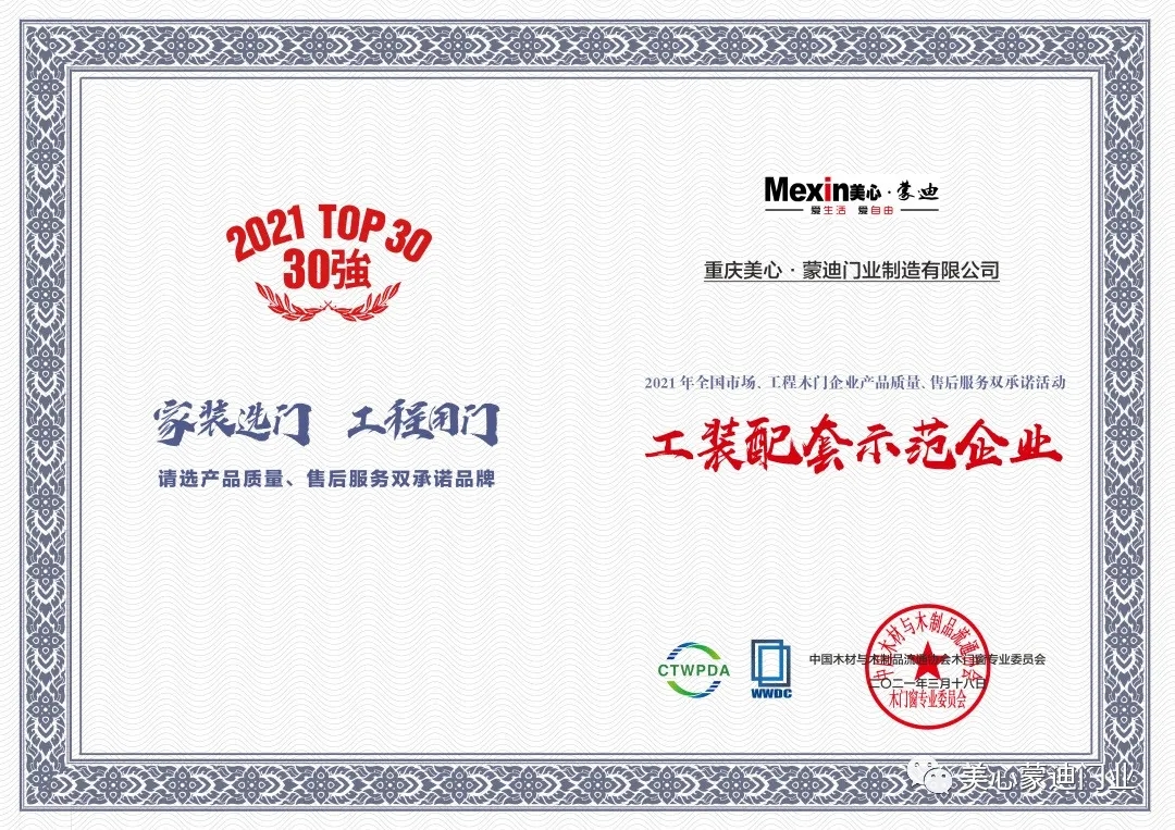 美心蒙迪门业再次荣膺2021年全国市场、工程木门企业产品质量、售后服务双