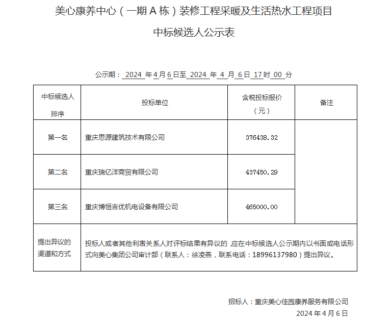 美心康养中心(一期A栋)装修工程采暖及生活热水工程项目 中标候选人公示