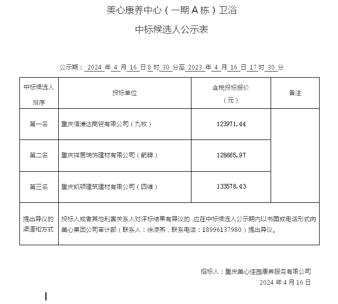 美心康养中心(一期A栋)卫浴 中标候选人公示