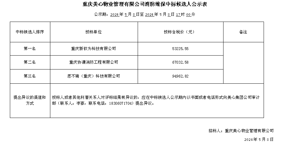 重庆美心物业管理有限公司消防维保中标候选人公示