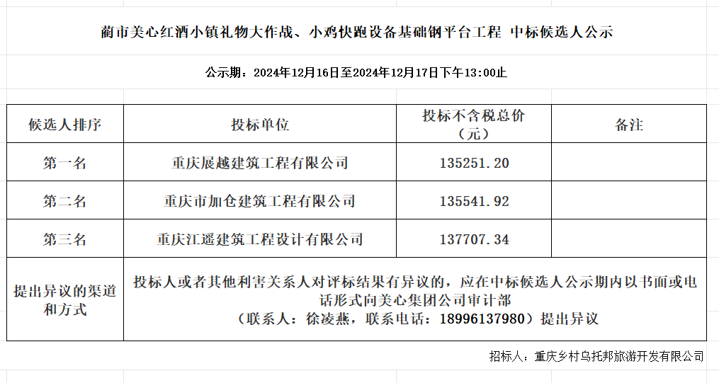 蔺市美心红酒小镇礼物大作战、小鸡快跑设备基础钢平台工程 中标公示