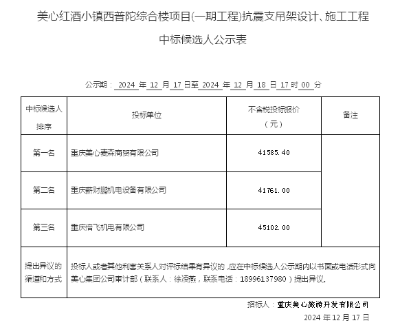 美心红酒小镇西普陀综合楼项目(一期工程)抗震支吊架设计、施工工程 中标候选人公示